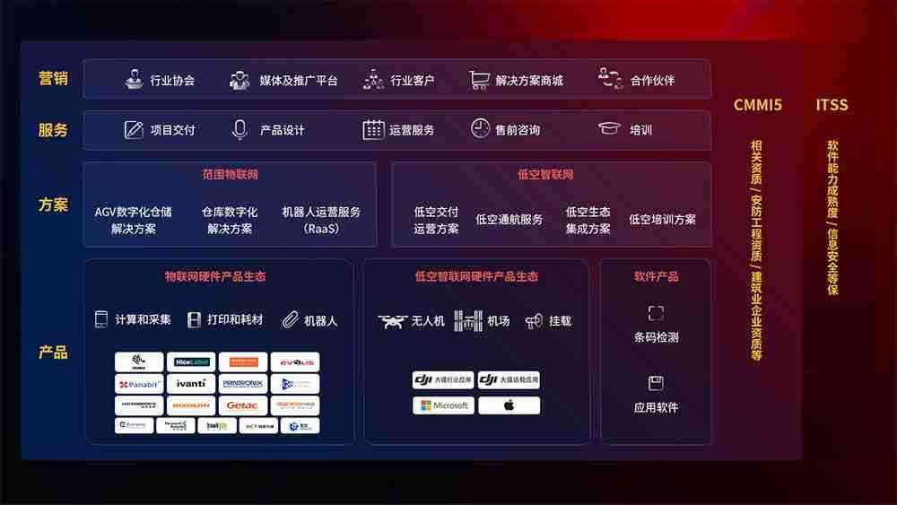 聚合国内外先进的物联网硬件产品品牌,,聚焦数字化仓储、、、机器人运营、、、低空智联网等领域,,,,共同打造适合客户业务场景的解决方案并提供交付服务