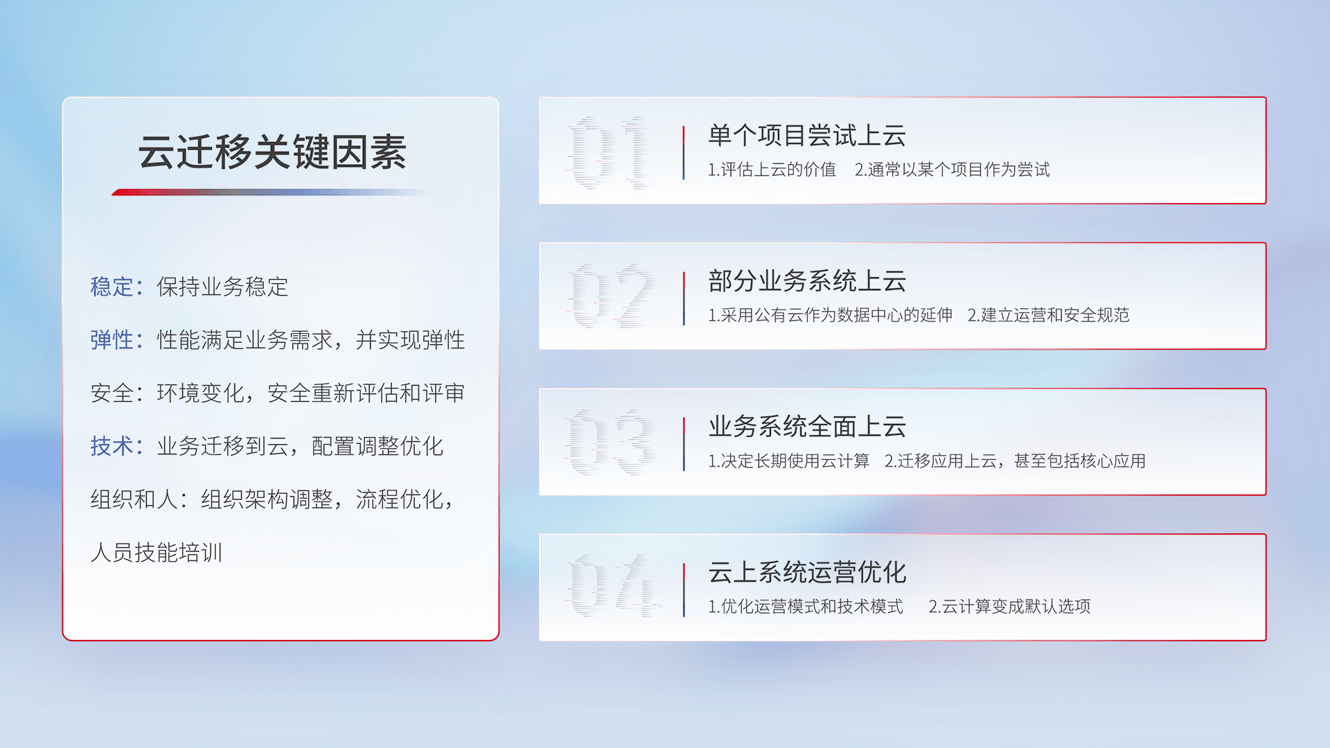 结合实际业务,,从规划设计、、、云平台选型、、、、云原生改造、、、数据迁移、、集成交付,,,,迁移全过程为客户识别最佳上云路径,,,,做好风险识别管理,,设计网络架构、、、、身份权限、、、安全审计合规、、操作审计、、、、日志审计、、、、监控告警策略、、、多站点容灾设计等,,,对云上基础设施进行整体规划,,提升IT治理水平,,,以满足弹性、、、、高可用、、、、高性能的需求。。。